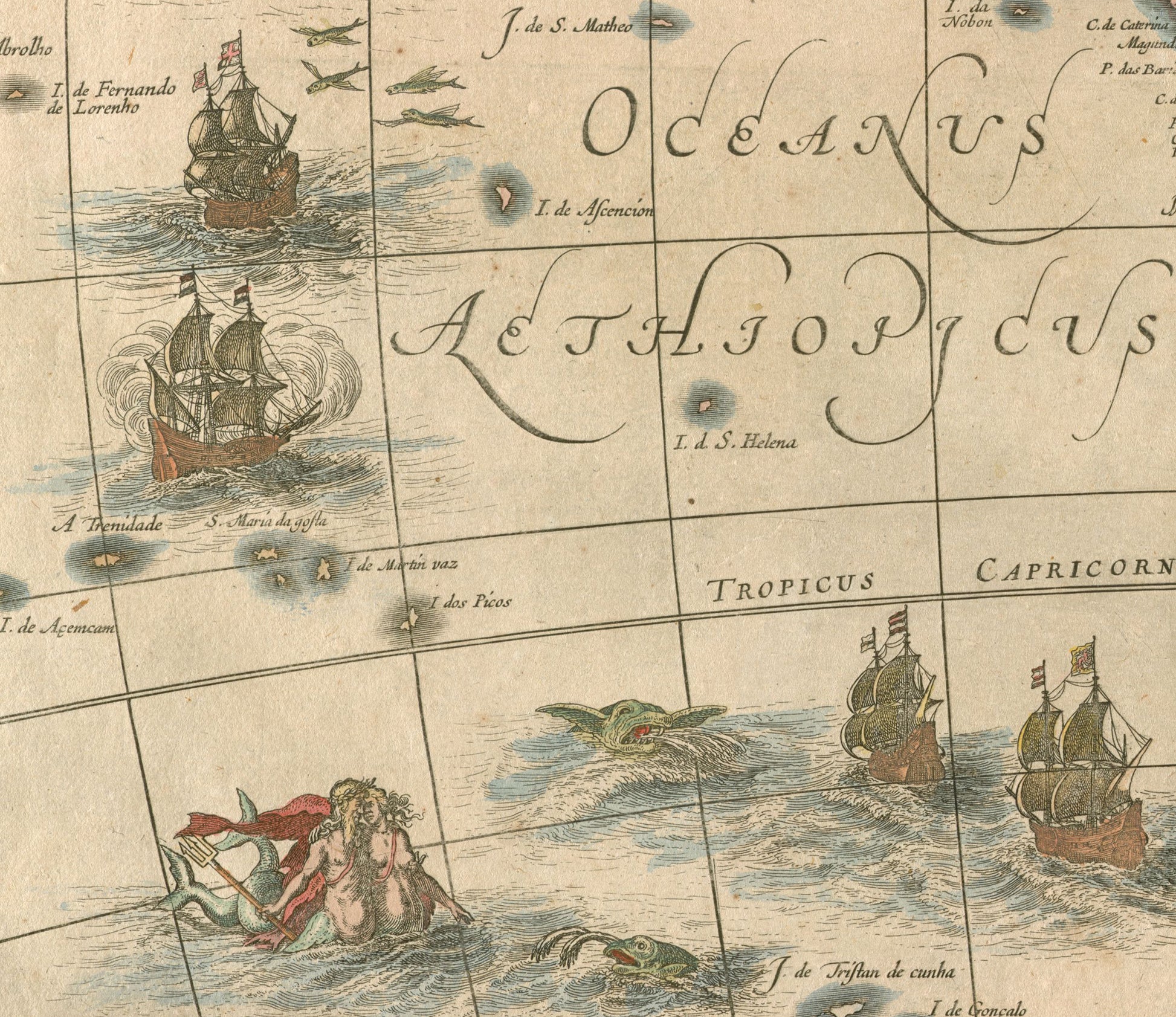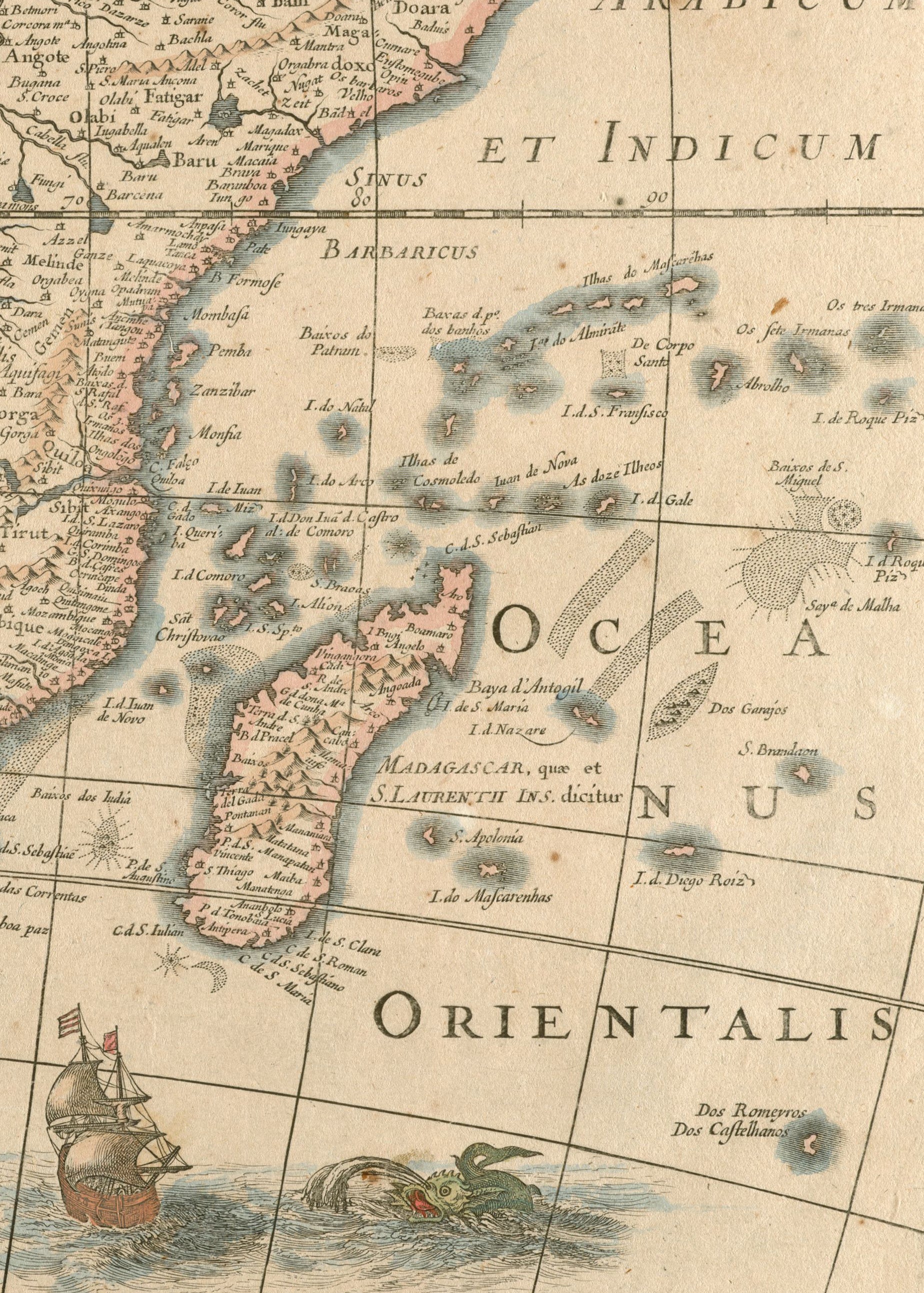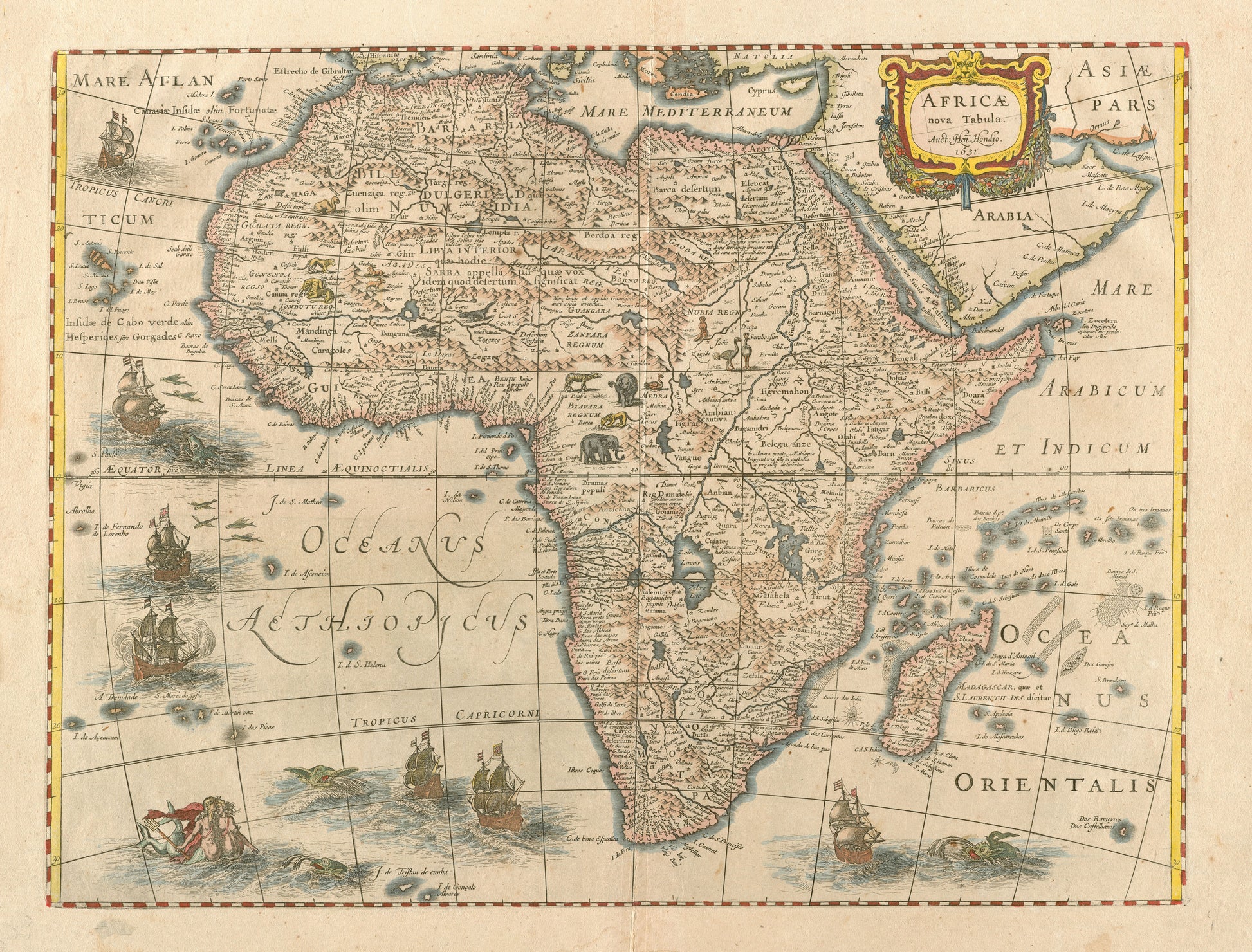 Produced during the Golden Age of Dutch cartography, this map blends period geography with decorative engraving: detailed coastlines, inland place names, an ornate title cartouche marked Africæ nova Tabula — Anno 1631, sailing ships, sea creatures, and vignetted animals that capture the spirit of exploration and early modern mapmaking. It’s a striking conversation piece for history lovers, collectors, or anyone drawn to antique cartographic art.