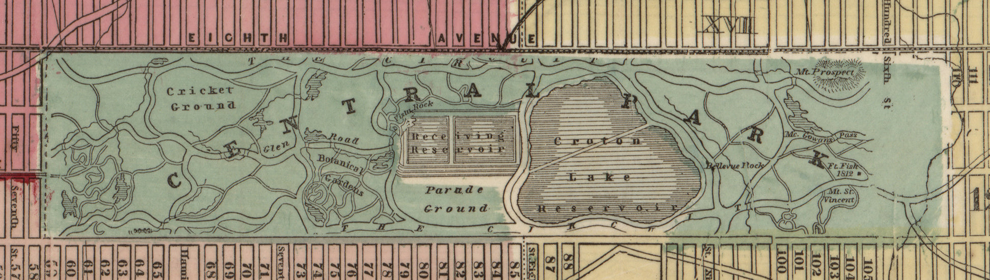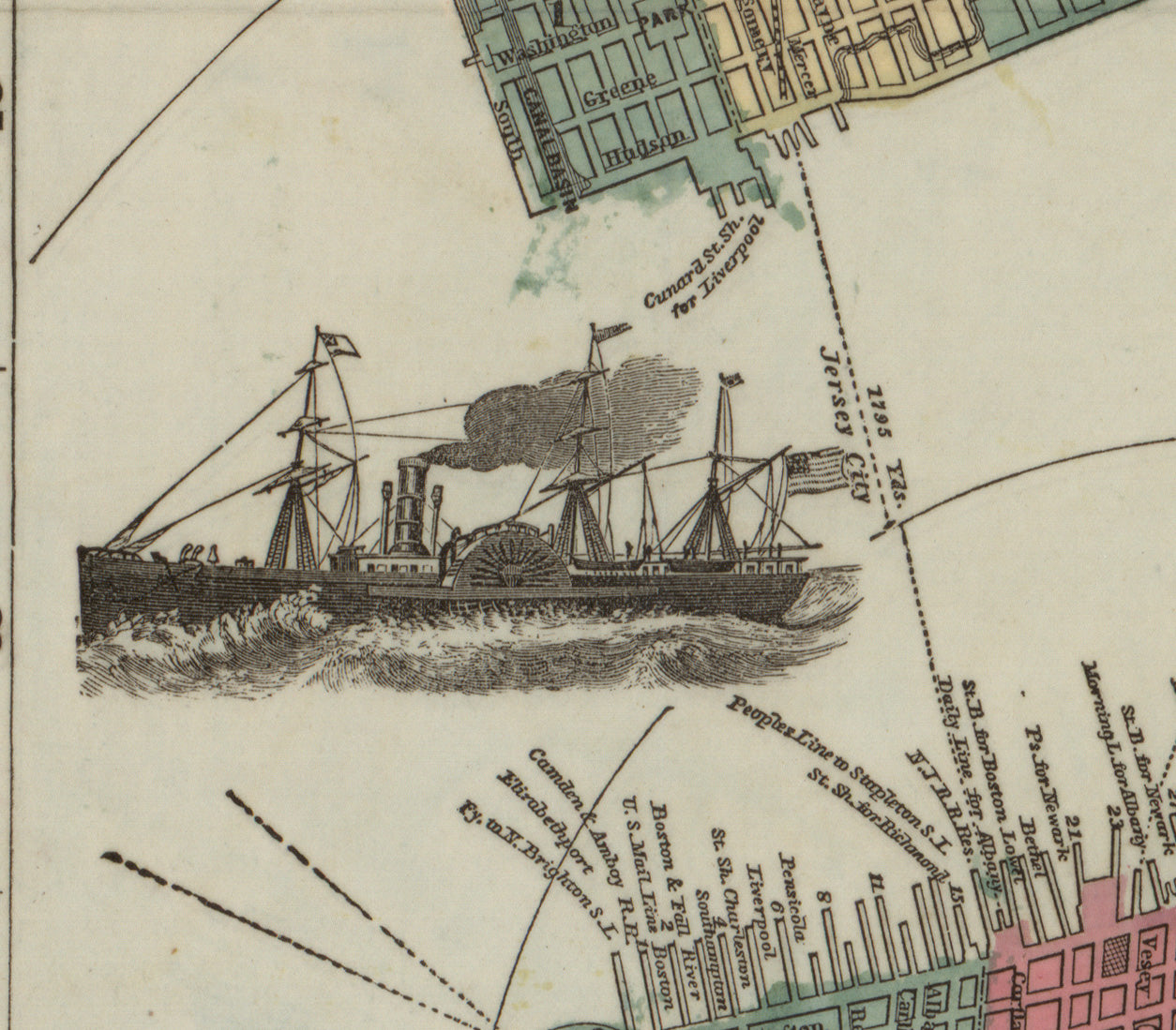 Rendered in classic antique pastel tones, the map highlights Central Park, the Hudson and East Rivers, and the early street plans of Lower Manhattan and Brooklyn. Elegant typography, engraved borders, and intricate ship illustrations across the harbor evoke the energy of a bustling 19th-century port city at the height of industrial progress.